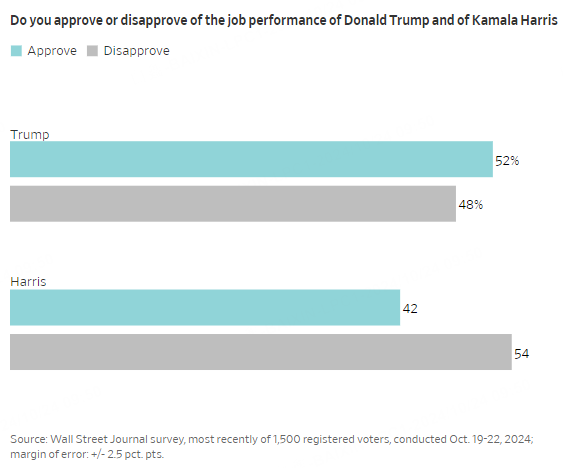 Views of Harris have turned more negative since August, when equal shares of voters viewed her favorably and unfavorably. Now, the unfavorable views are dominant by 8 percentage points, 53% to 45%. Moreover, voters give Harris her worst job rating as vice president in the three times the Journal has asked about it since July, with 42% approving and 54% disapproving of her performance.