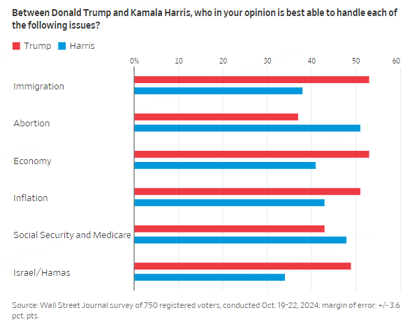 Harris's lead as the best candidate to handle abortion -- her strongest issue -- has narrowed slightly, from a 20-point advantage to 14 points.