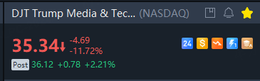 The stock, DJT, was down 12% to $35.34 at Thursday's close. DJT dropped 22% on Wednesday, its biggest decline since April, but it has still roughly doubled this month.