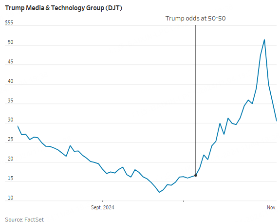 The most obvious trade is DJT, and it worked perfectly. It rose and occasionally fell almost exactly in line with the betting odds, more than tripling in price by Tuesday, before tumbling as his odds worsened in the past few days.