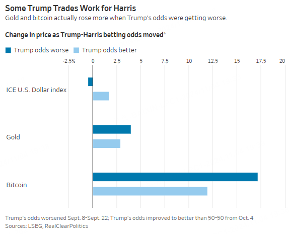 Gold has been on a tear for a while, amid concerns about global tensions and moves away from the dollar as a reserve currency. Trump might be better or worse for gold than Harris, but either way the price actually rose more when his odds were falling during September than it has since Trump was at 50-50.