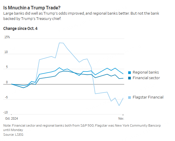 Banks seem to offer more clarity. Big banks beat the S&P, and regional banks did better still, with the Trump trade theory of lower regulation offering support. But the most obvious Trump bank trade is Flagstar Financial, the New York bank bailed out by Steven Mnuchin, Trump's former Treasury secretary. Its shares have fallen sharply, even as the rest of the sector has rallied. Perhaps the bank rally is more about the fast-growing economy than the Trump trade.