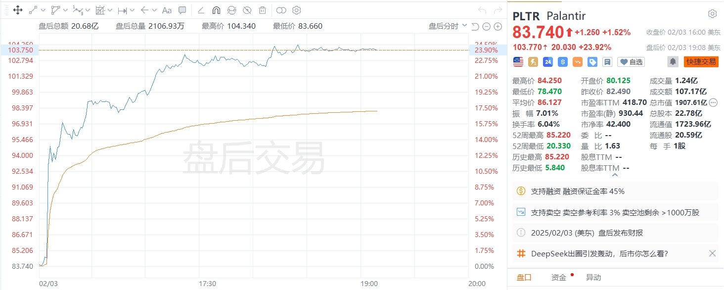 格隆汇2月4日|Palantir盘后大涨近24%,报103.77美元。Palantir四季度营收8.275亿美元,分析师预期7.759亿美元。预计2025年营收37.4亿-37.6亿美元,分析师预期35.4亿美元。预计一季度营收8.58亿-8.62亿美元,分析师预期8.029亿美元。