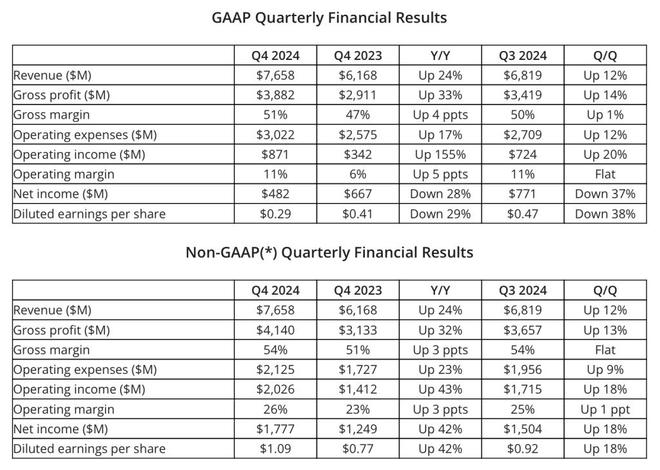 当地时间2月4日美股盘后,AMD公布了截至2024年12月31日的2024年第四季度业绩,报告期间公司营收达到76.58亿美元,同比增长24%,高于市场预期的75.3亿美元;美国通用会计准则下(GAAP)净利润为4.82亿美元,上年同期为6.67亿美元,同比下降28%;非美国通用会计准则下(Non-GAAP)净利润同比增长42%至17.77亿美元,摊薄后每股收益同比增长42%至1.09美元,略高于市场预期的1.08美元。