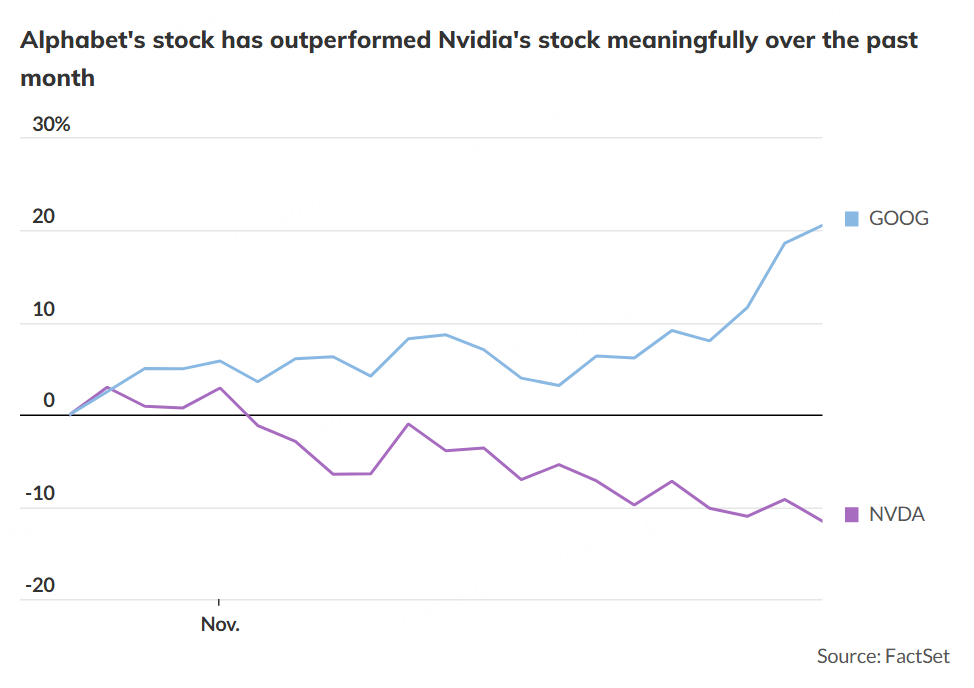 Alphabet’s stock has risen 56% over the past three months, bringing its year-to-date gains to 71%. Nvidia’s stock is off 2% over a three-month span but ahead 32% in 2025.