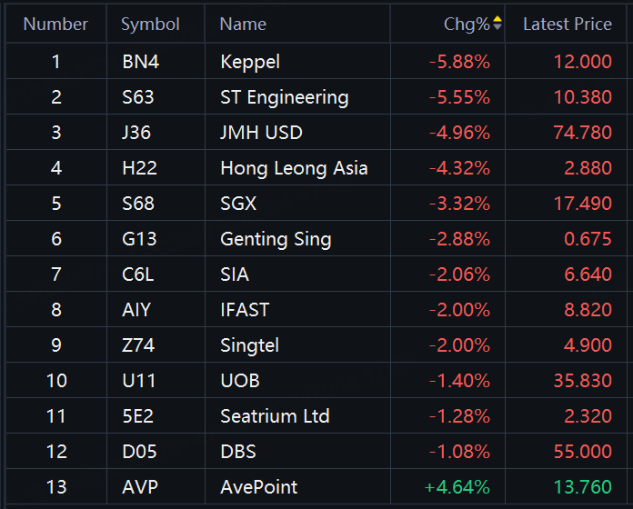Keppel, ST Engineering down over 5%; SGX, Genting Sing down around 3%; SIA, Singtel down 2%; DBS down 1%.