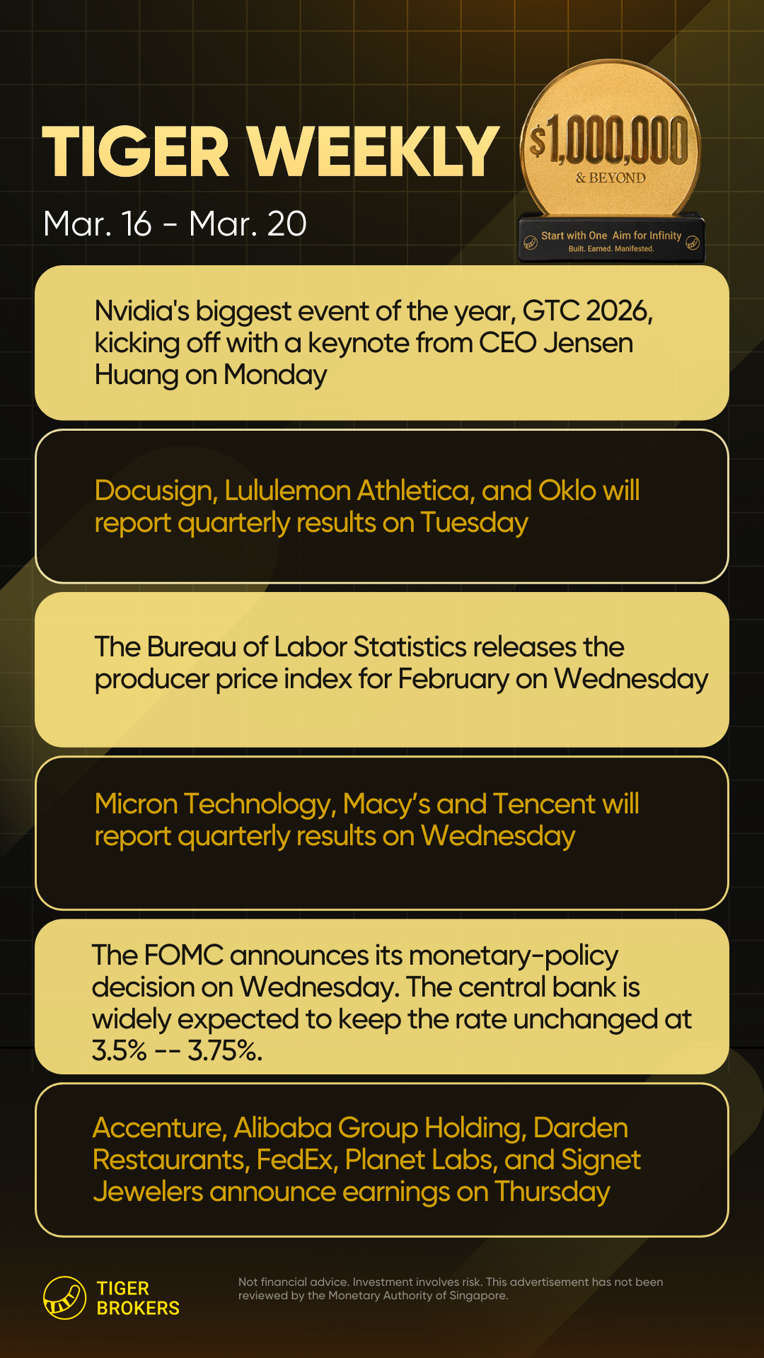 In company news, Nvidia AI conferene, GTC 2026, will run from Monday through Thursday. A sparse earnings calendar has Lululemon Athletica reporting results on Tuesday, followed by Micron Technology on Wednesday and FedEx on Thursday.
