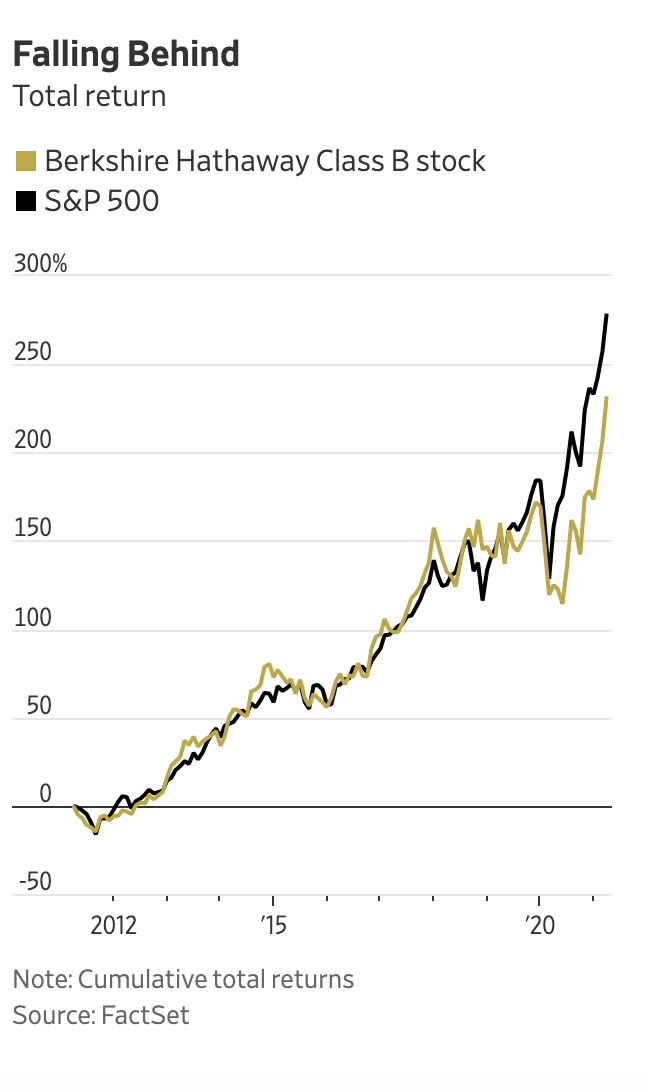 在巴菲特的領導下,該公司從1965年到2020年的年複合增長率爲20%,超過了同期標普500指數(S&P 500)包括股息在內10.2%的漲幅。伯克希爾過去三年期和五年期的總回報率分別爲12%和14%,而該指數的回報率分別爲19%和18%。
