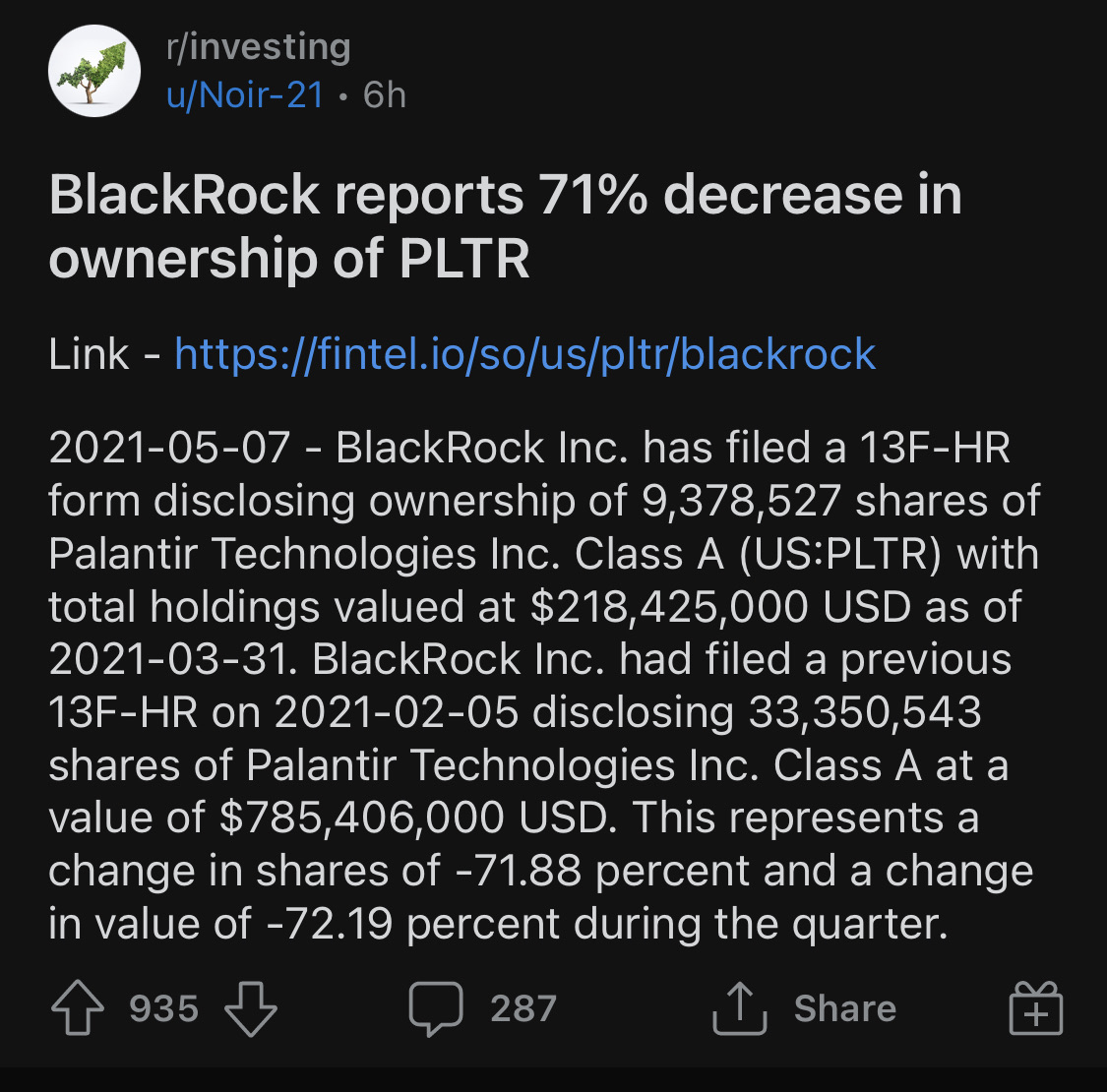 BlackRock Inc reduced their holdings of PLTR by 71%, as can be seen in their recent 13Ffiling disclosing an ownership of 9,378,527 shares compared to the previously filed 13F on 5 Feb 2021 which disclosed an ownershipof 33,350,543 shares.