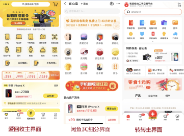 目前,從產品界面看,愛回收與轉轉都是進入APP主界面就是3C產品銷售,而閒魚的3C藏在“省心賣”的鏈接裏,進入之後銷售品類、頁面佈局等與另外兩家的差異不大。