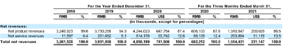 來自三個平臺的收入被分爲兩大塊,分別爲產品收入和服務收入。