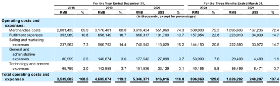 從成本及費用表來看,僅商品成本(回收的產品成本和運費)和履約費用(平臺經營、線下商店和倉庫運營相關開支、外部運費)合共佔收入的比重已接近100%的水平,反映在扣除經營開支之前的利潤空間已相當小,更別提還有營銷費用、行政費用、研發費用等。