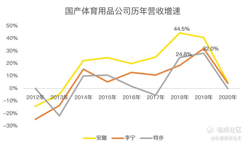 最近3年,以安踏、李寧爲首的體育用品公司業績開始爆發,以安踏爲例,2018年至2020年的營收增速分別爲44.5%、40.6%和5%。