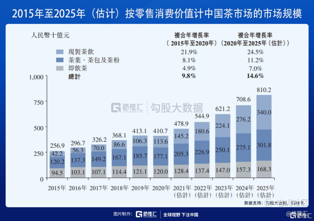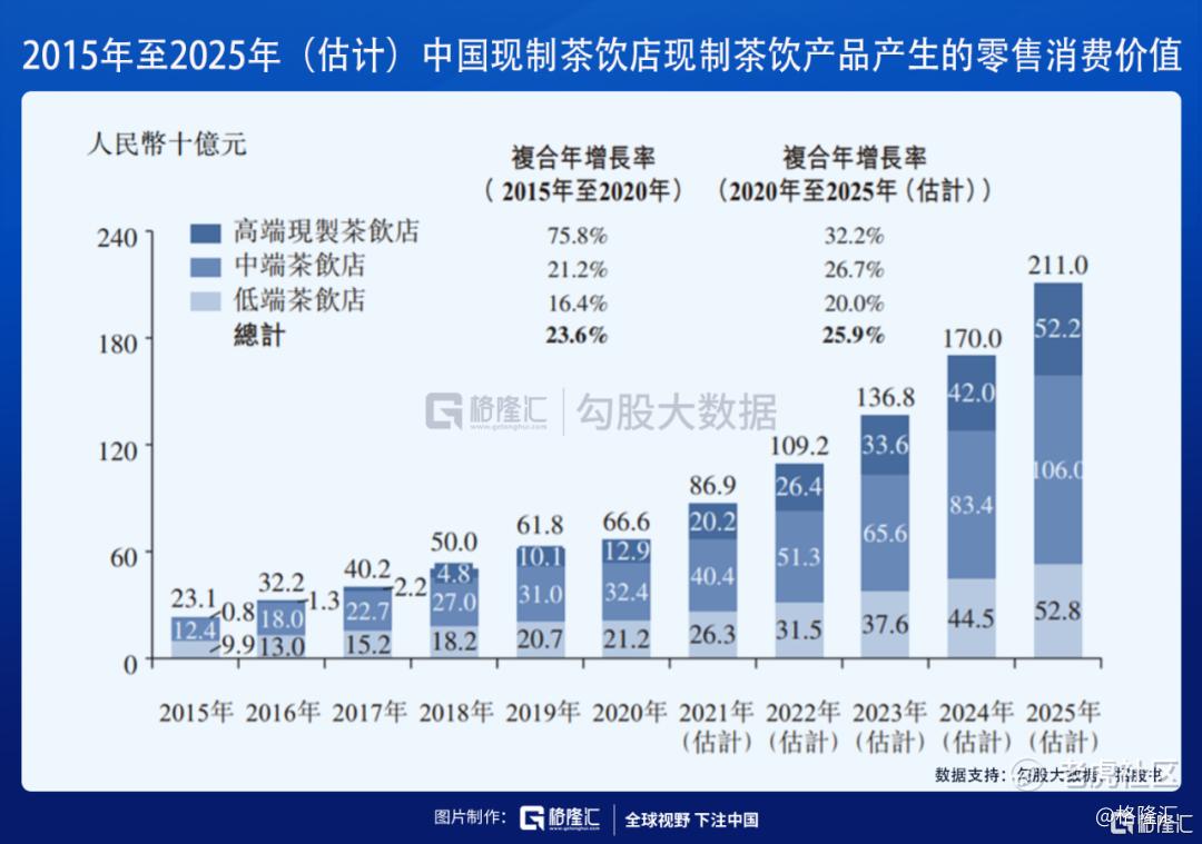 而在現製茶飲裏,增長最好的又是高端現製茶飲。2015年-2020年的年複合增長速度高達75.8%,行業規模達到了129億人民幣。這個成長符合我們的認知,因爲這幾年我們見證了奈雪的火爆。根據灼熾諮詢的報告,2020年-2025年高端茶飲將繼續延續高成長,年複合增速達32.2%。