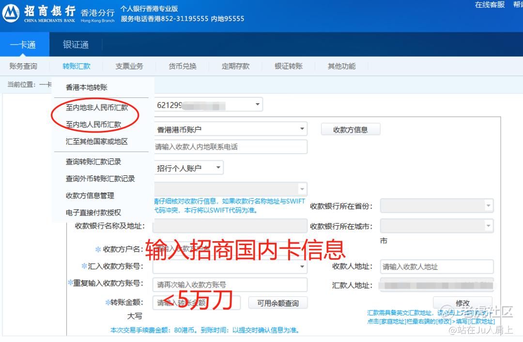(1)轉賬匯款-至內地非人民幣匯款-填寫本人招商國內卡信息-填寫金額(<5萬刀)-確認信息無誤後點擊確認-國內卡接收港元特產-結匯!