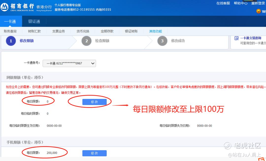 一卡通-其他功能-限額管理-修改每日限額至上限100萬(手機APP默認上限20萬)-確認!