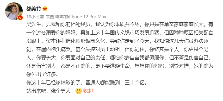 這個事情還在繼續發酵中,還不知道都美竹手上有多少驚人的爆料,這次堪稱是內娛頂流男藝人崩塌的最強案例!