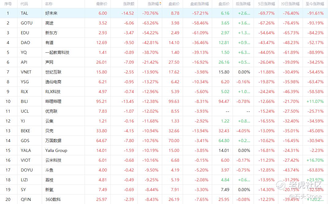 目前中概股殺跌的市場中,技術指標幾乎可以算是全瞎,不要再依靠什麼拖底大單、什麼等待下影線、什麼量價背離等等,那些更多的都是事後諸葛亮,不然亮下實盤,估計自己說的股票都未必會買入,搞那麼一堆技術指標出來,看起來花裏胡哨,相當專業,實則關鍵時刻掉鏈子。來看看$好未來(TAL)$ 、$新東方(EDU)$ ,一天跌掉70%,我也算是開了眼了,沒出現暴跌之前的技術指標在哪?之前抄底的人,估計埋在了半山腰,這個股票我看不清底在哪,而對於我來說這類股票也只能做預判……