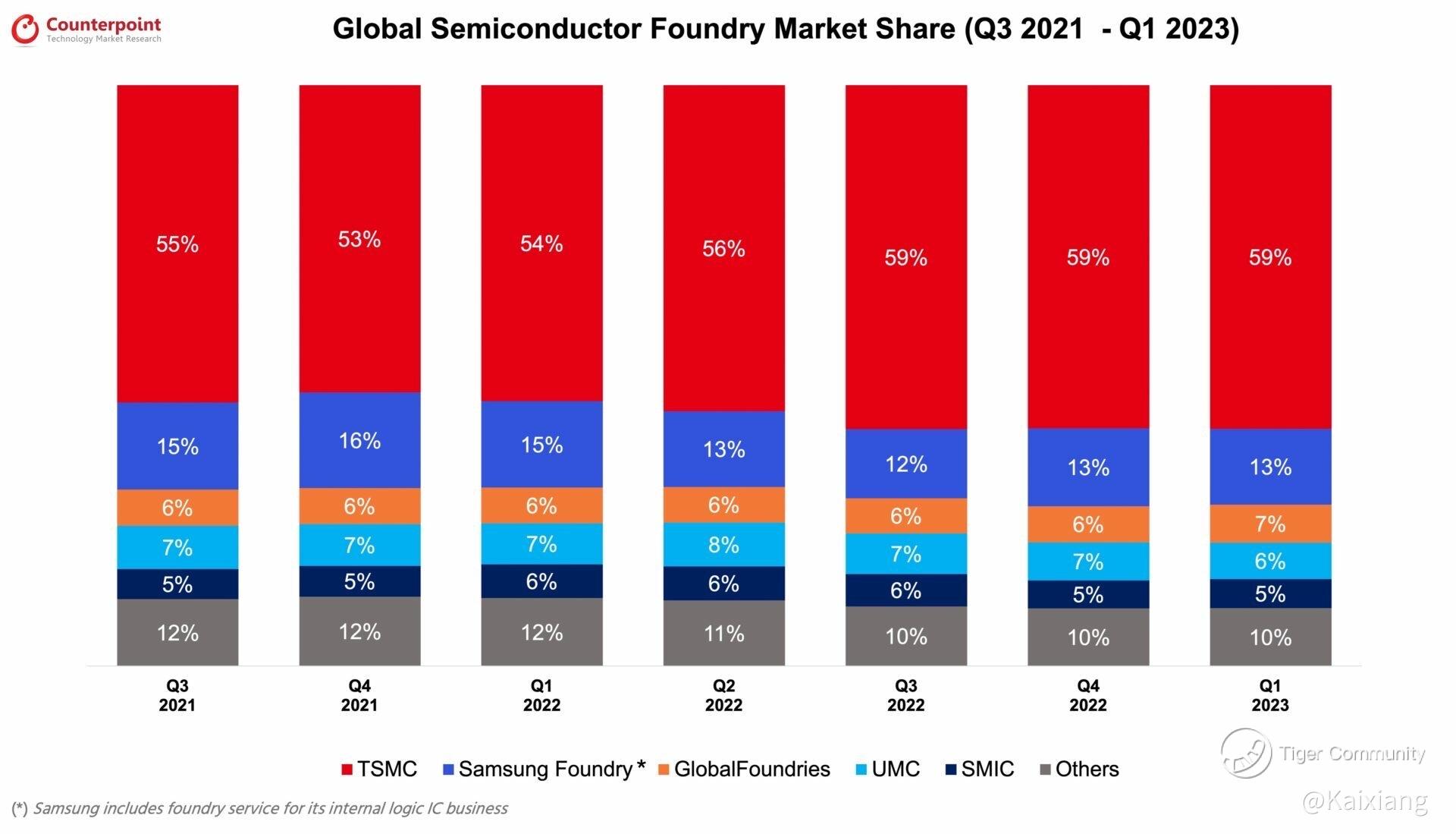 TSMC has been relentless in its pursuit of advanced manufacturing processes and cutting-edge chip technologies, solidifying its reputation as the go-to foundry for semiconductor. It has consistently dominated the market by commanding 59% of the market share. The next biggest player, i.e. Samsung, only holds 13% of the market shares.