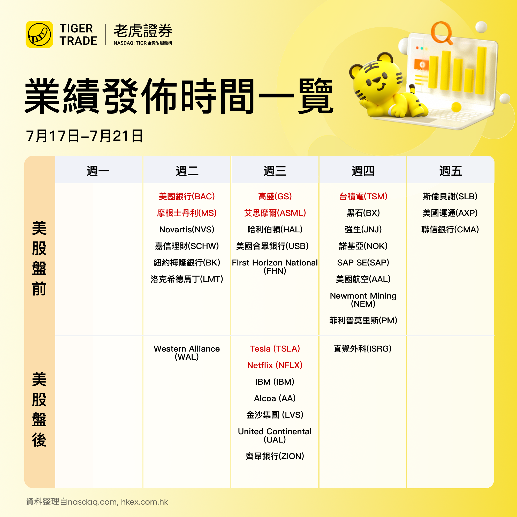 下週,美股銀行股率先拉開Q2財報季序幕,值得小虎們重點關注的有銀行股 $美國銀行(BAC)$ , $摩根士丹利(MS)$ , $高盛(GS)$ , $阿斯麥(ASML)$ , $臺積電(TSM)$ ,全球行業巨頭 $特斯拉(TSLA)$ , $奈飛(NFLX)$ 。[666]