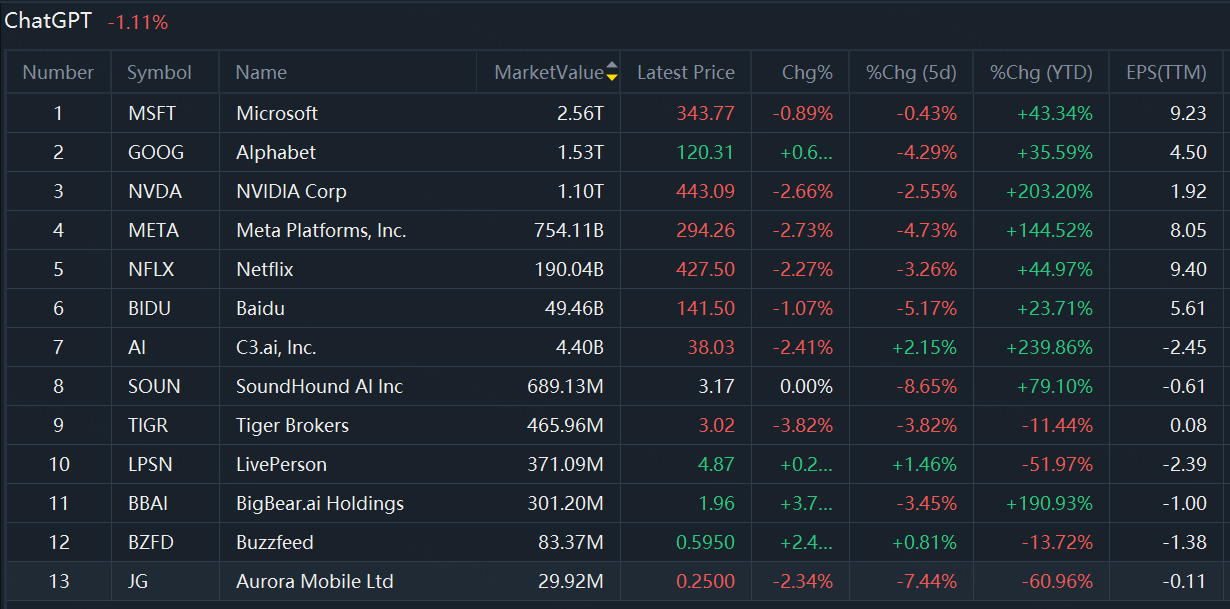 Regarding Chatgpt concent, Except for $C3.ai, Inc.(AI)$ , $LivePerson(LPSN)$ , and $Buzzfeed(BZFD)$ , most of the other stocks showed downward adjustments in the past five trading days. Below are some tops news related to Big AI companies.