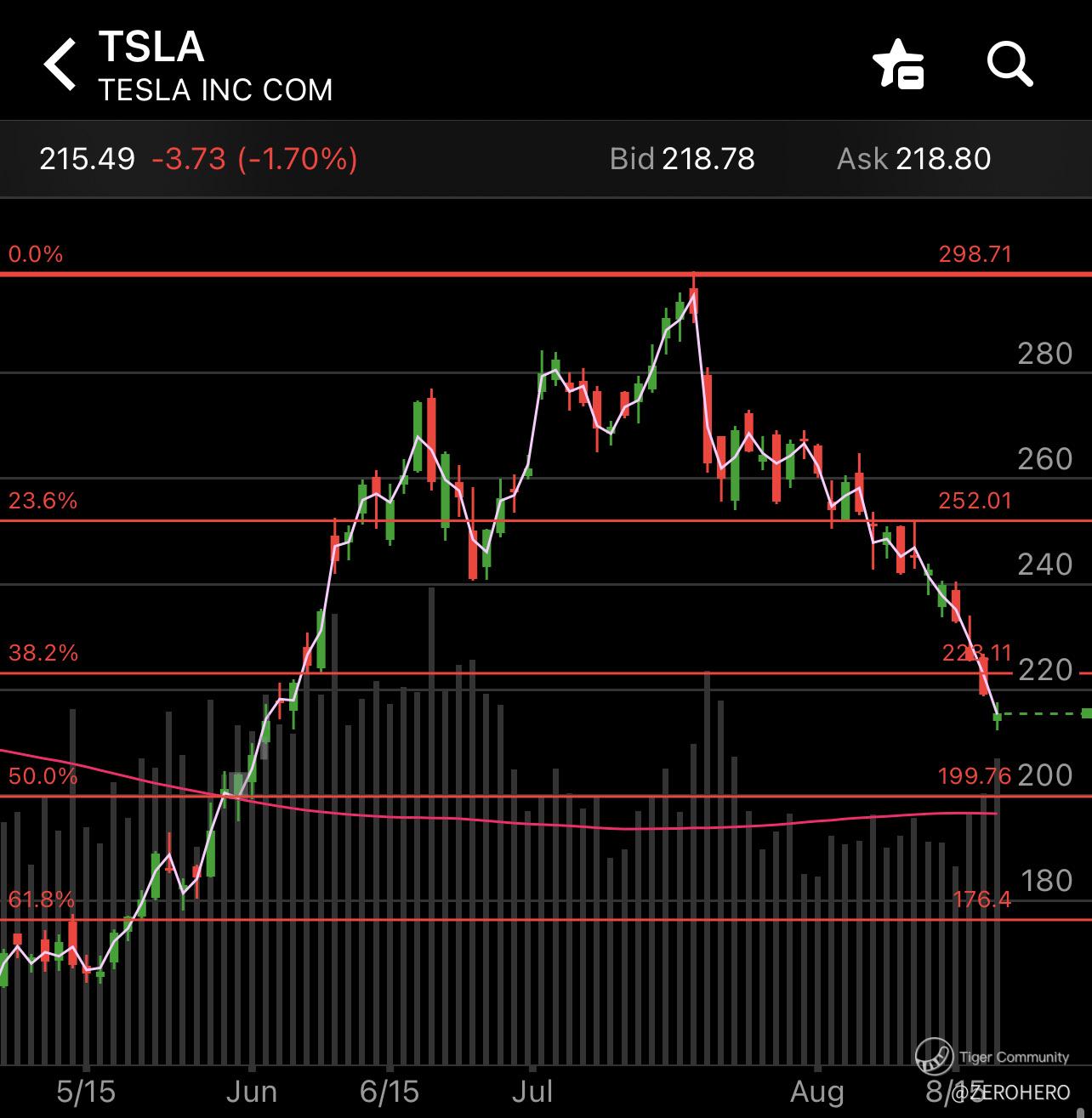 TSLA dropped 1.7% to $215.49 which marked the sixth consecutive drop for Tesla stock and the 13th in the past 14 trading sessions.