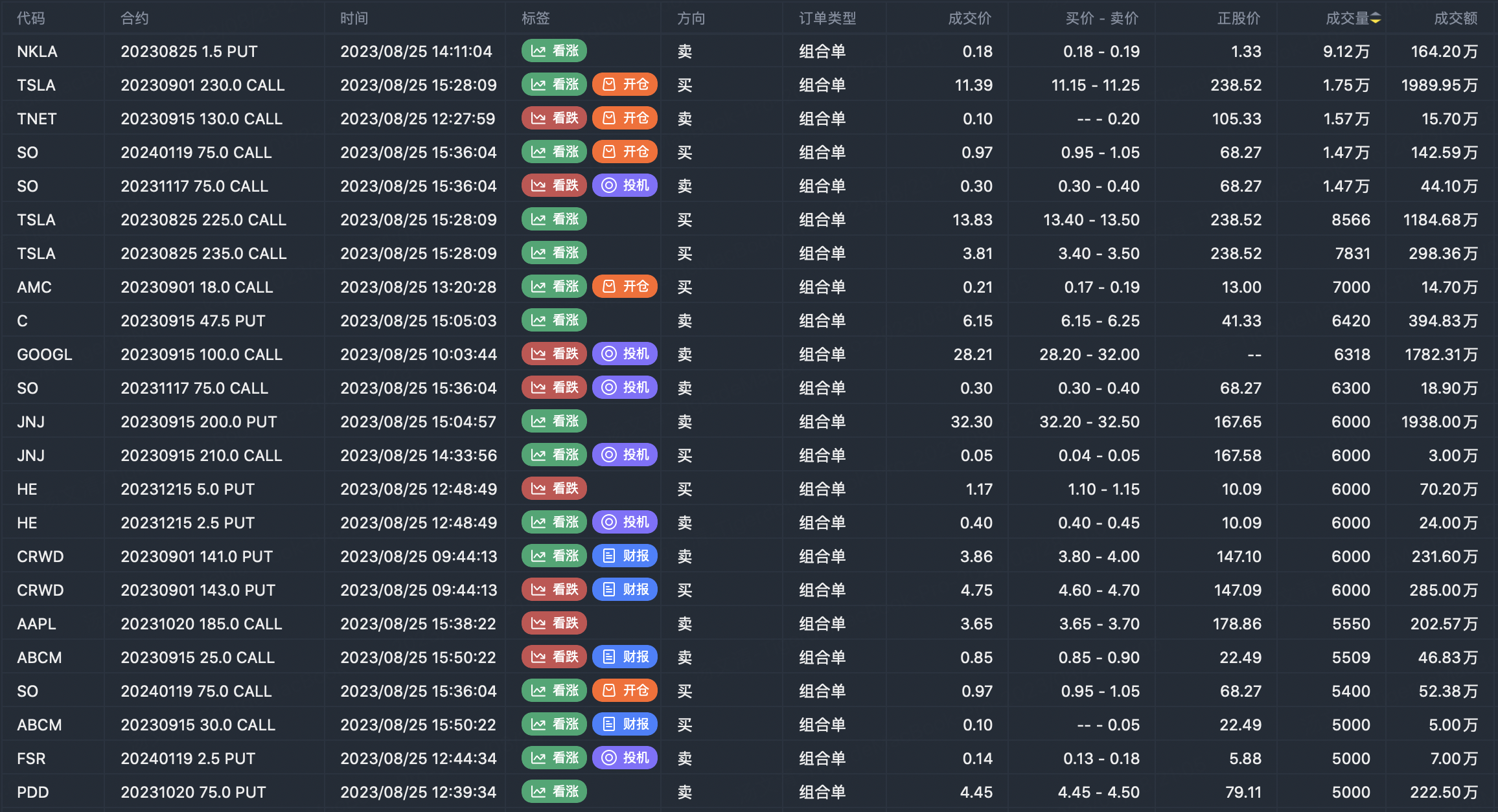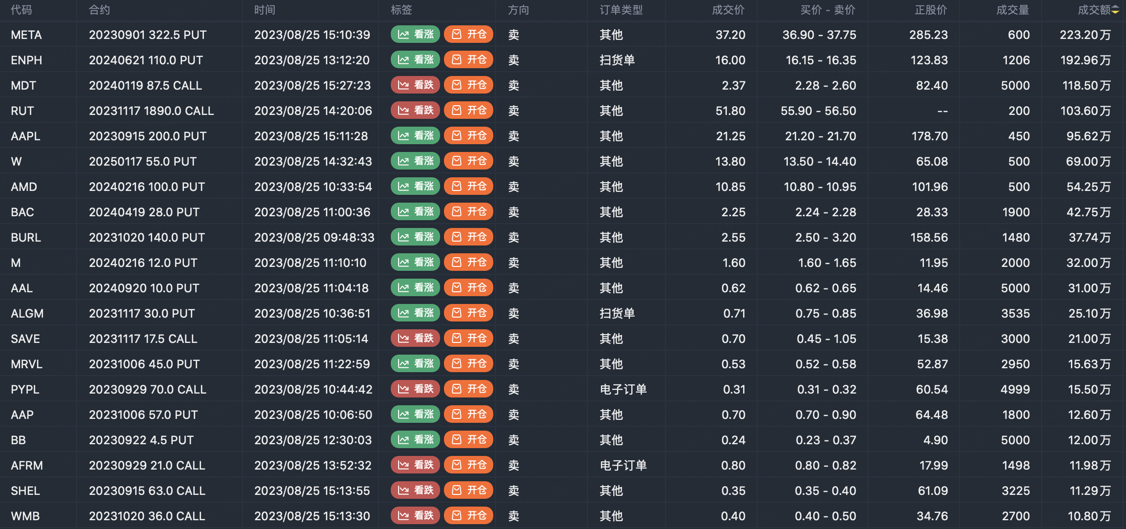 Note: This image data is from Tiger PC. This screen is a significant sell open position for an option contract in the market. A sell of a call option means that the trader believes that the underlying trend has peaked, and a sell of a put option means that the trader believes that the underlying trend has bottomed. These contract openings typically indicate significant activity in the underlying stock, including whether the trader is willing to accumulate a long or short option position.