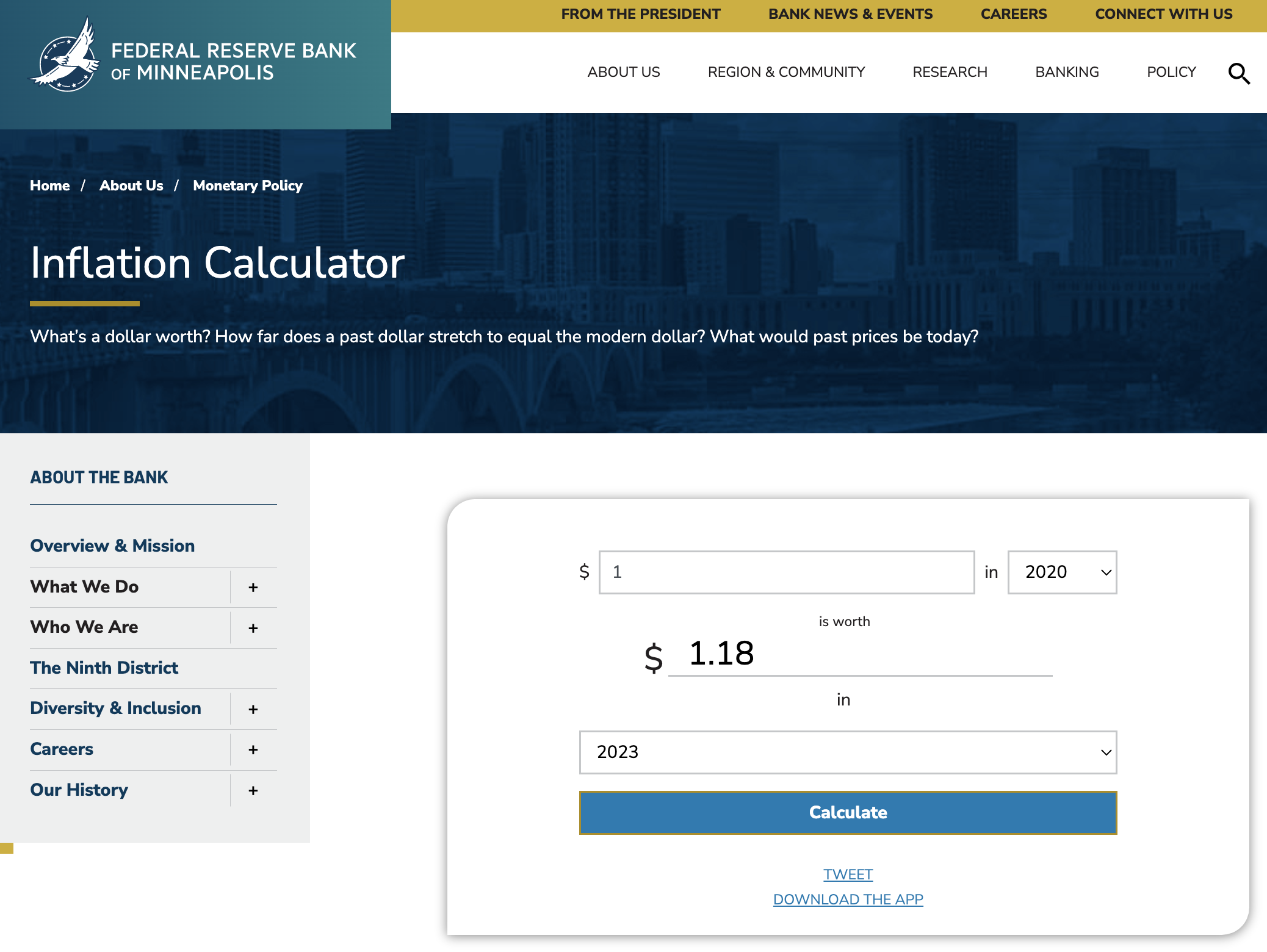From 2020 to 2023, we have an accumulated inflation of 18% as per the inflation calculator above from the Federal Reserve Bank of Minneapolis.