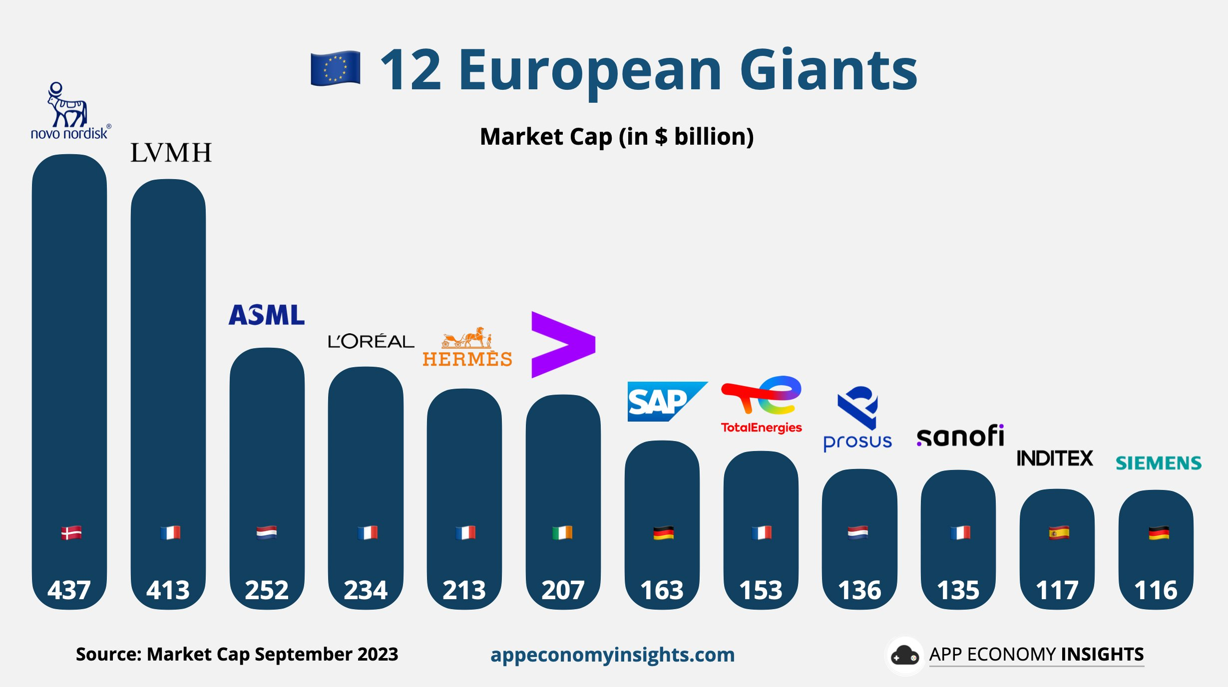 $Novo-Nordisk A/S(NVO)$ $LVMH-Moet Hennessy Louis Vuitton(LVMHF)$ $ASML Holding NV(ASML)$ $L'Oreal Co.(LRLCY)$ $Hermes International SA(HESAY)$ $Accenture PLC(ACN)$ $SAP SE(SAP)$ $Total SA(TTE)$ $Prosus NV(PROSY)$ $Sanofi SA(SNY)$ $Industria de Diseno Textil Inditex SA(IDEXY)$ $Siemens AG(SIEGY)$