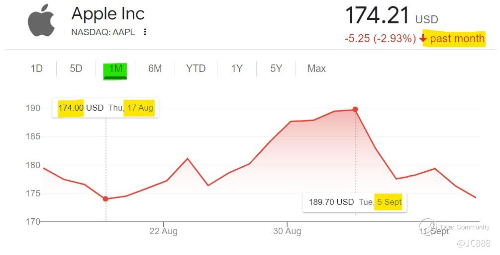 • Apple stock has started to trend downwards since 05 Sep 2023 onwards.