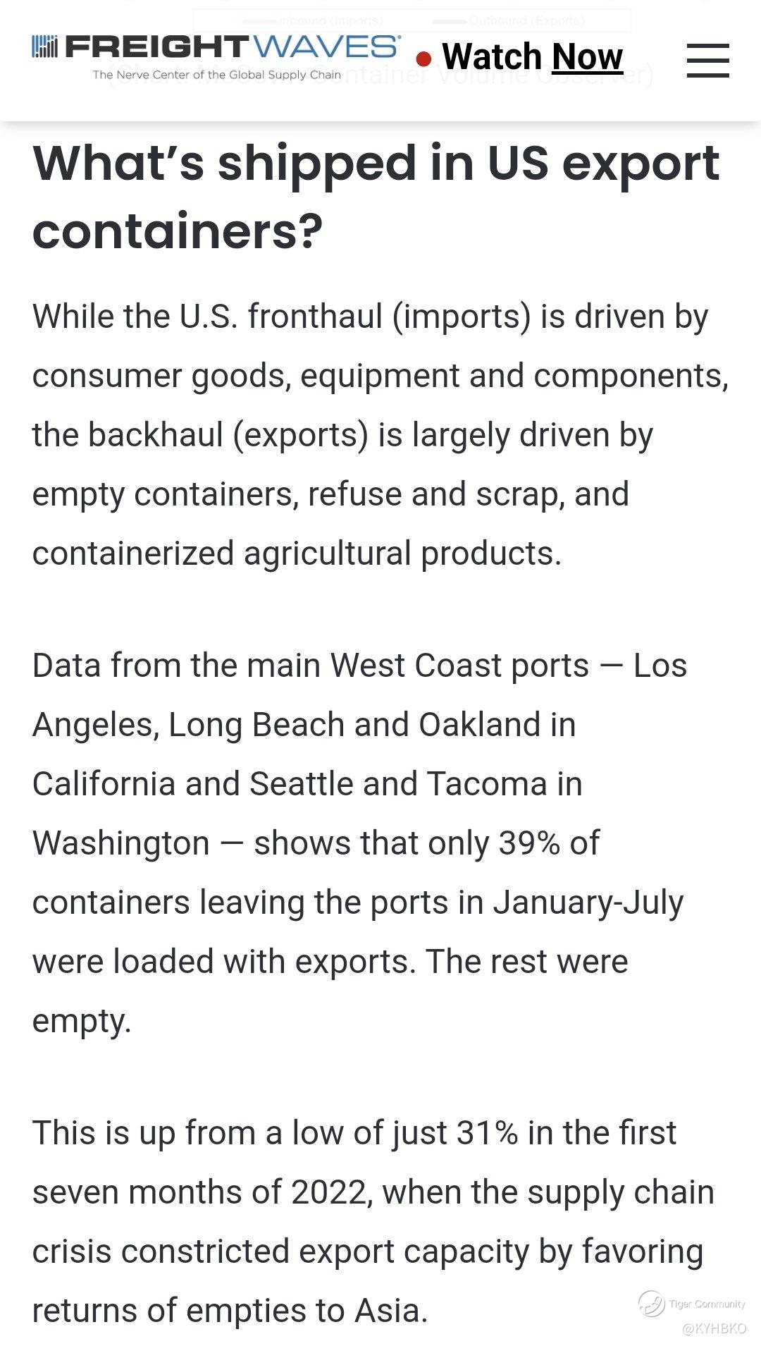 FreightWave > The imbalance of import & export-led to an increase in exporting "empty containers" from the USA. Only 39% of export containers leaving the USA are laden with cargo. Is this not a concern?
