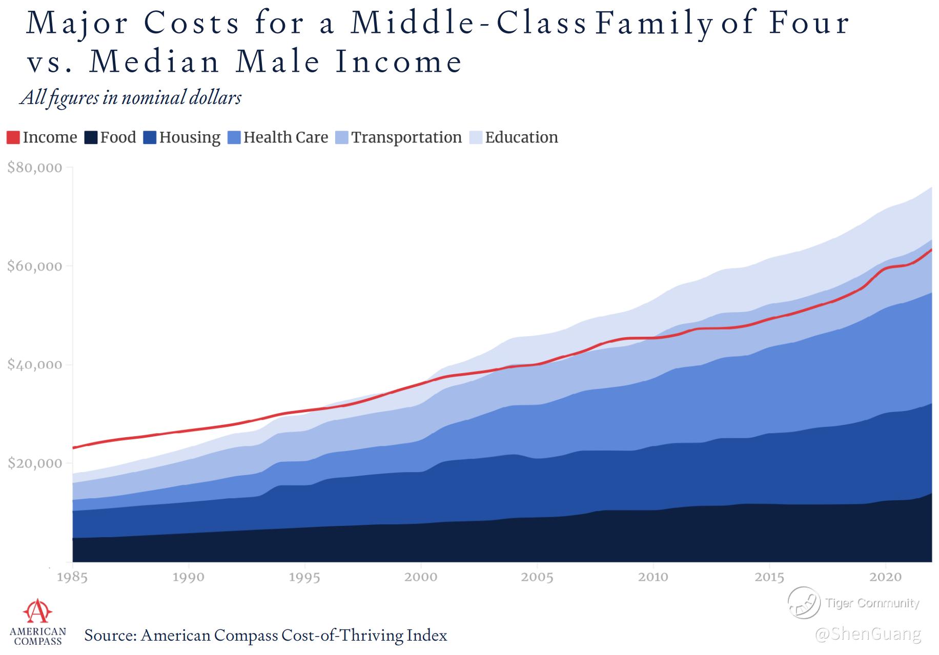 In a report published earlier this year, think-tank American Compass estimates that its Cost of Thriving Index (essentially, an index that quantifies the affordability of "middle-class" amenities such as housing and healthcare) for an average family of four has been increasing in long-term trends since 1985.