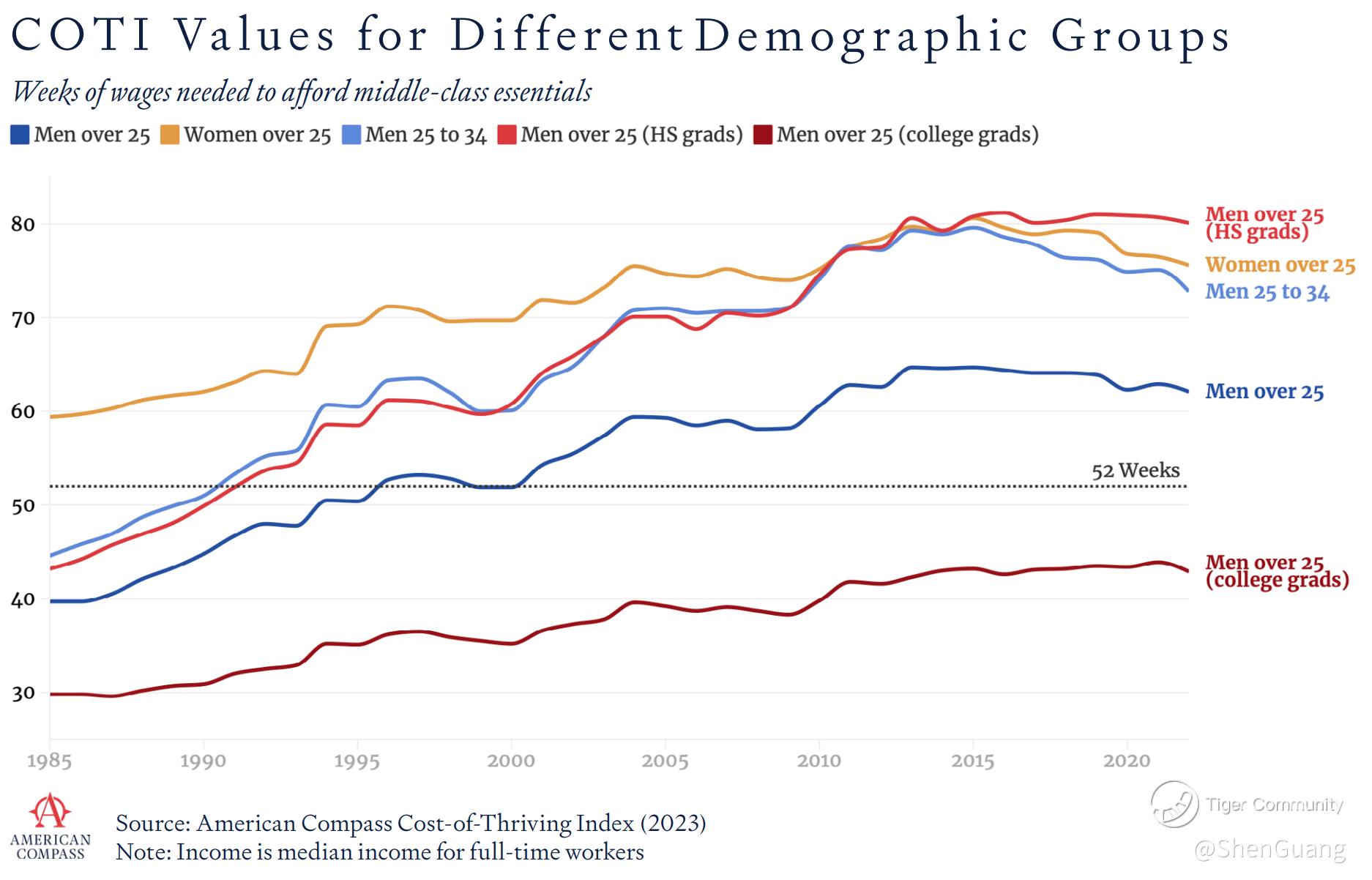 “While the typical man working full-time in 1985 could support a family on 40 weeks of income and then still have income from roughly 20% of the year left to cover other expenses and save, a comparable man working full-time in 2022 would work the whole year and still come up ten weeks short.”