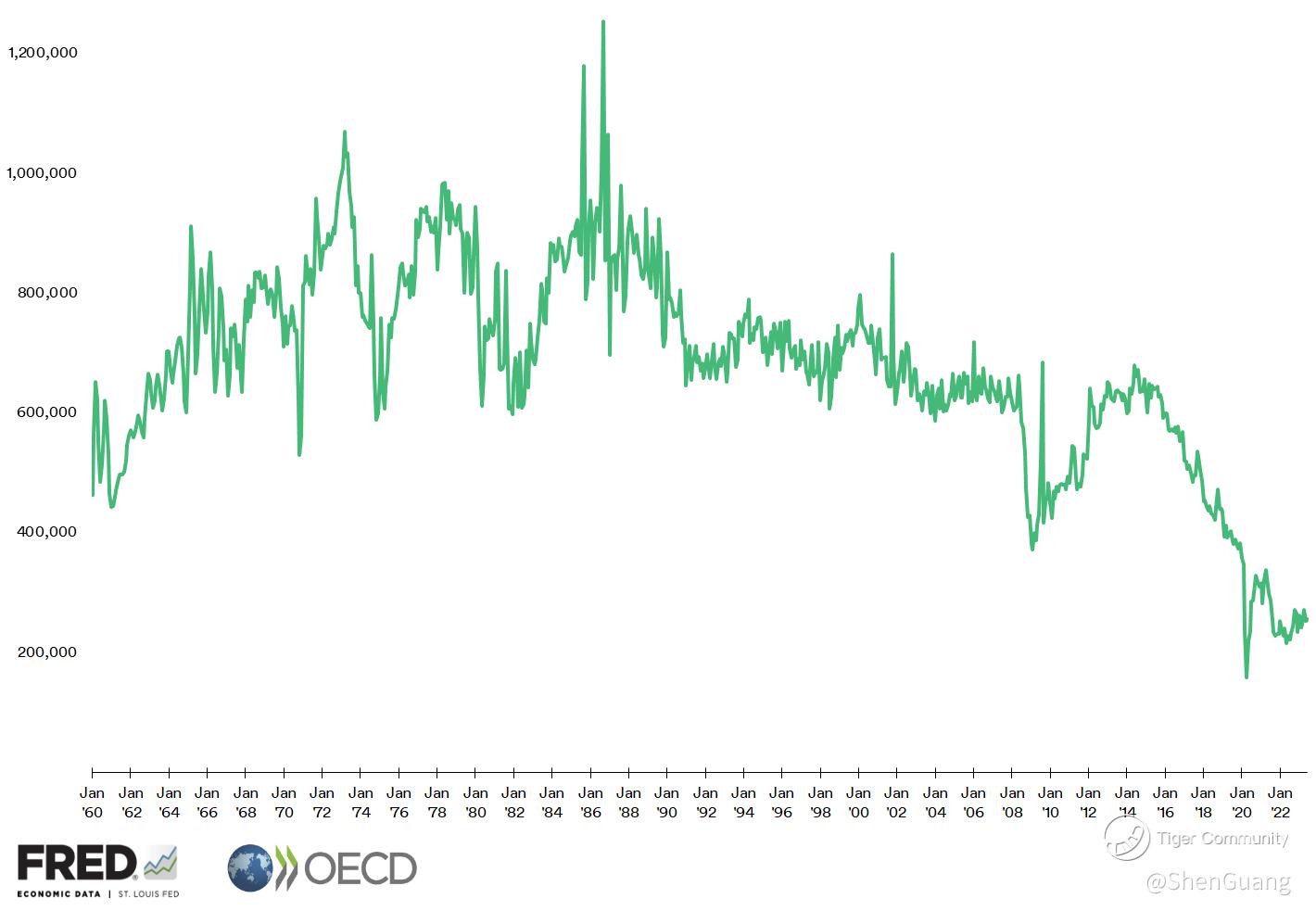 Overall, new car sales have been in decline in the U.S. for some time now, with the used car market rising in price as a result. This decline becomes even starker in the present day: as of June of this year, monthly passenger car registrations in the U.S. are the lowest in over 63 years. The high water mark was September 1986 when more than 1.25 million cars were registered.