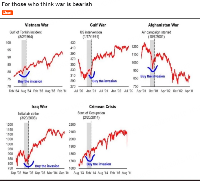 The war bulls list the wars and index performance. It seems that 4 out of 5 presented upward momentum after the war broke out.