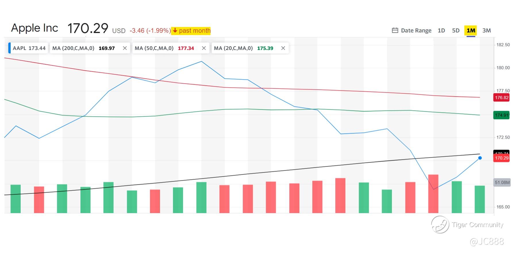 However, applying technical analysis on Apple stock(see above), it has been trading below its [1] 20-day moving average (ma), [2] 50-day ma and its [3] 200-day ma.