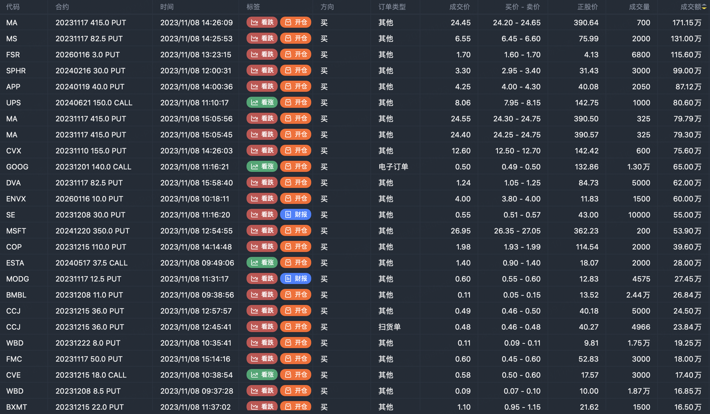 Note: This image data is from Tiger PC. This screening is a significant buy open position for options contracts in the market. The purchase of a call option means that the trader believes that the underlying has upward momentum, and the purchase of a put option means that the trader believes that the underlying has downward momentum. These contract openings typically indicate significant activity in the underlying stock, including whether the trader is willing to accumulate a long or short option position.