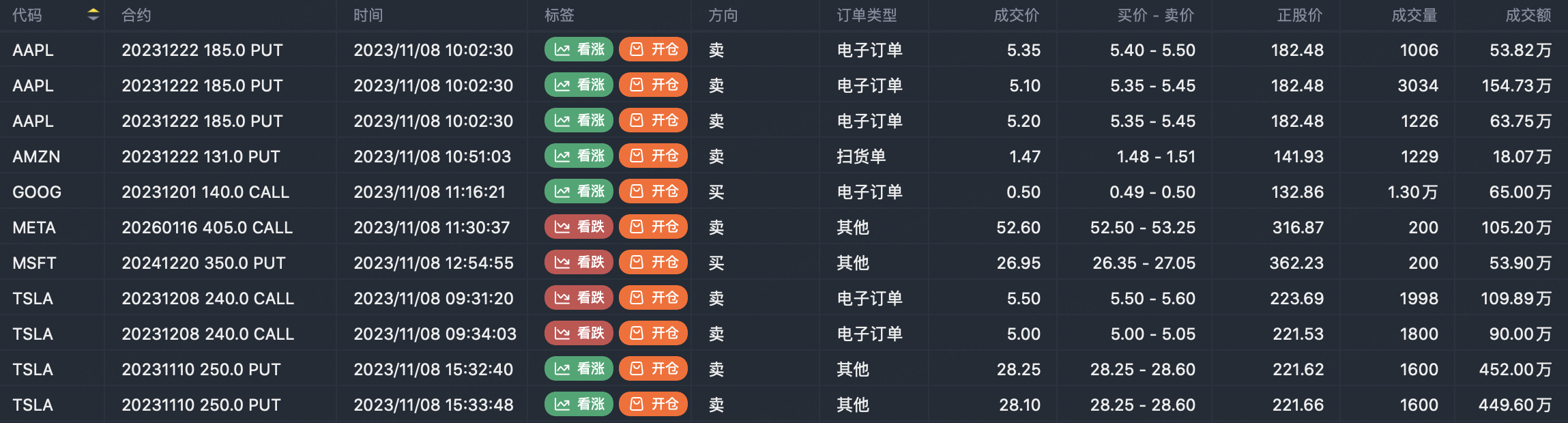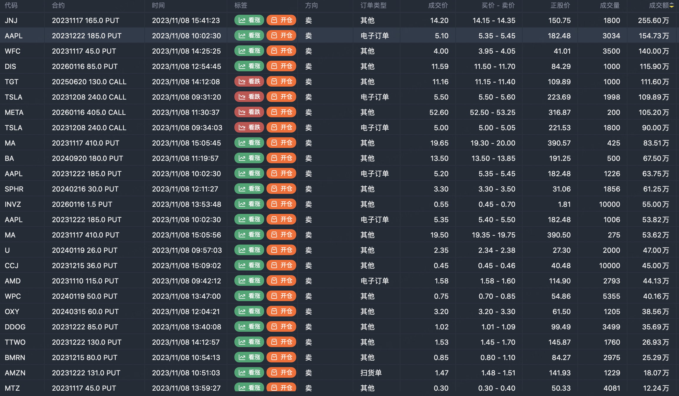 Note: This image data is from Tiger PC. This screen is a significant sell open position for an option contract in the market. A sell of a call option means that the trader believes that the underlying trend has peaked, and a sell of a put option means that the trader believes that the underlying trend has bottomed. These contract openings typically indicate significant activity in the underlying stock, including whether the trader is willing to accumulate a long or short option position.