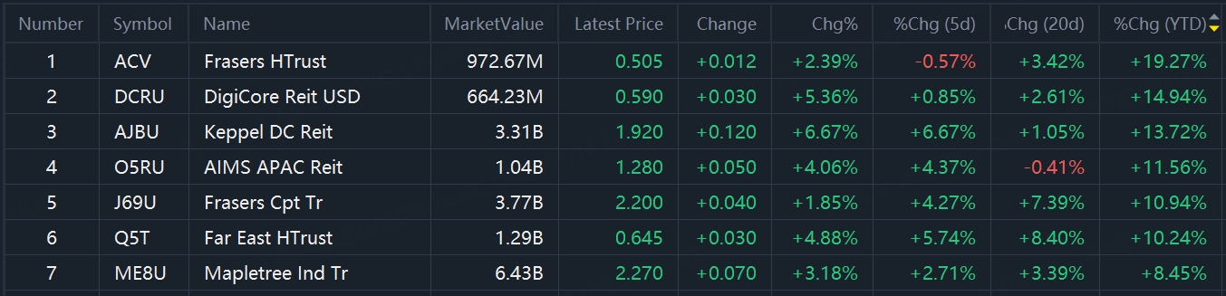 As for the SGX REITs, we see 7 of them with a YTD 2023 of more than 8%: $Frasers HTrust(ACV.SI)$, $DigiCore Reit USD(DCRU.SI)$, $Keppel DC Reit(AJBU.SI)$, $AIMS APAC Reit(O5RU.SI)$, $Frasers Cpt Tr(J69U.SI)$, $Far East HTrust(Q5T.SI)$, $Mapletree Ind Tr(ME8U.SI)$.