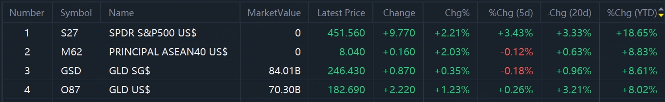 Among the SGX ETFs there are only 3 with a YTD 2023 of more than 8%: $SPDR S&P500 US$(S27.SI)$, $PRINCIPAL ASEAN40 US$(M62.SI)$, $Global Systems Dynamics Inc.(GSD)$, $GLD US$(O87.SI)$.