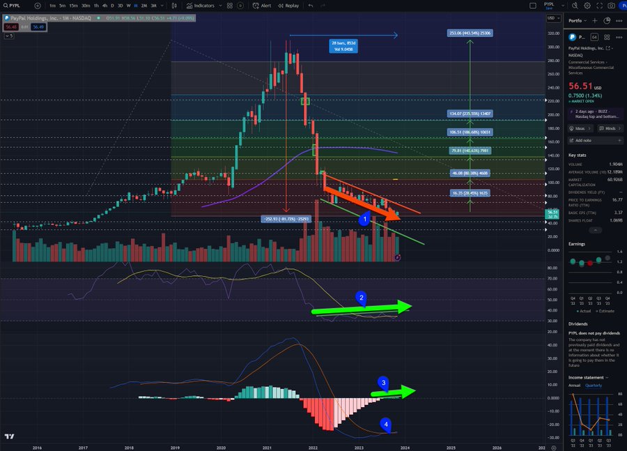 Cited from Macro Economist @Micro2Macr0, When in doubt zoom out, is a saying, for a reason. $PayPal(PYPL)$stock has been dropping for 3 years. 2 of which has had bullish divergence forming on the RSI (2), and also 4 months of bullish divergence on the MACD (3), of which the trend line (4) has flipped bullish too, in the last few months, for the first time in OVER 2 years. This is what you want for a setup. $100 in the next year should be pretty easy. Maybe well beyond.