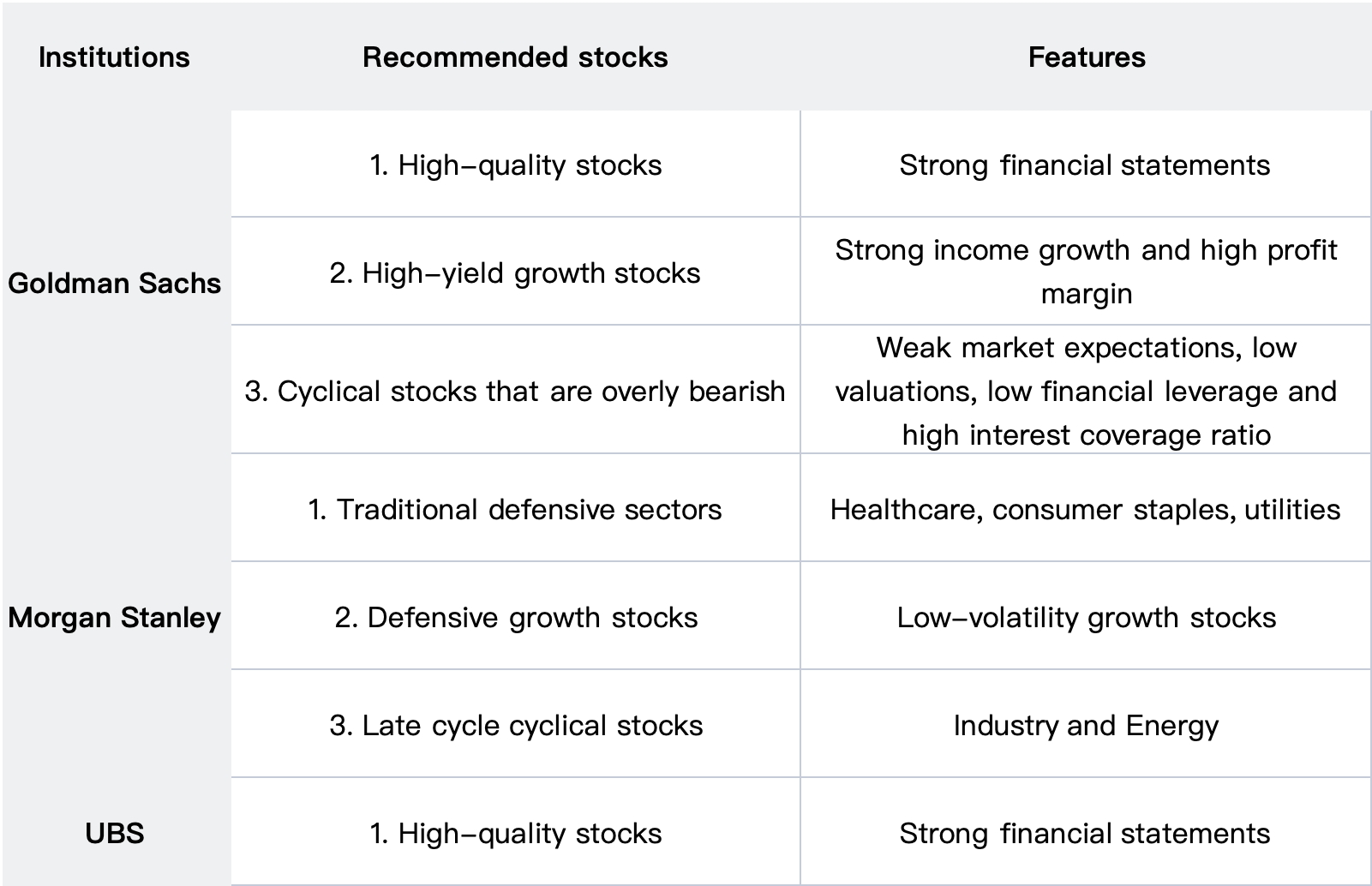 Overall, both Goldman Sachs and Morgan Stanley recommend a 'barbell' approach consisting of defensive stocks, growth stocks, and cyclical stocks, aiming for a combination that balances defense and growth.