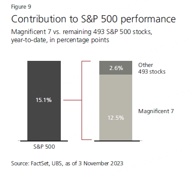 According to UBS statistics, the S&P 500 has gained 15.1% so far this year, of which the Magnificant 7 have contributed 12.5%, accounting for 83% of the total return.