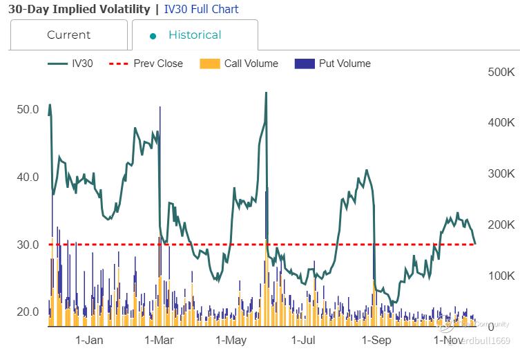 Salesforce's last earnings implied volatility (IV30) going into earnings was 35.7. The last time CRM released earnings, the implied volatility dropped to 24.1, resulting in an implied volatility crush of 33%. 5 days after earnings, the 30 day IV was 22.8.