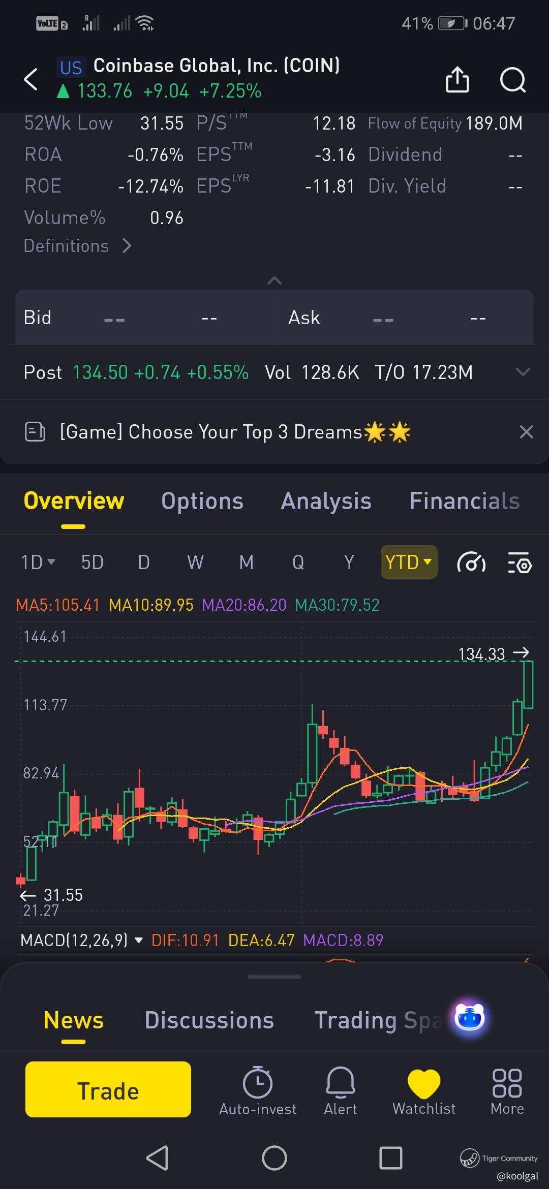 Share price has been going up like a rocket to the moon! It has closed 7% up on Friday and in the past week it has jumped 19%. Year todate Coinbase has tripled in value by a whopping 298%! That is rather amazing considering Coinbase's share price has plunged to a low USD 31.55 in the past 52 weeks.