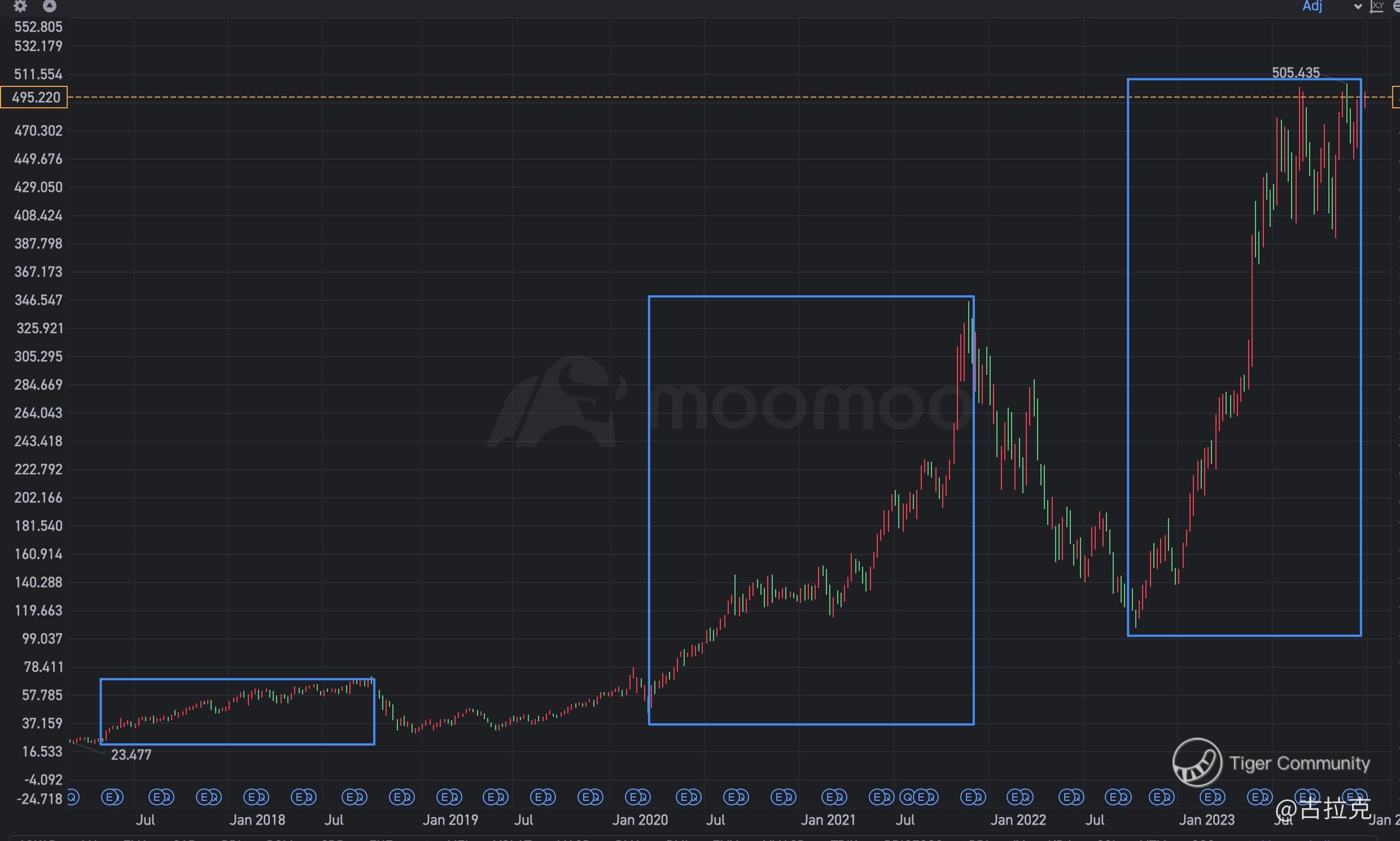 2. In March 2020, amid the COVID-19 pandemic, Nvidia initiated its second explosive rally, witnessing a tenfold increase from its lowest point to its peak by October 2021. This surge was fueled by the generous liquidity injection post-pandemic, coupled with strong demand for Nvidia graphics cards for Ethereum mining.
