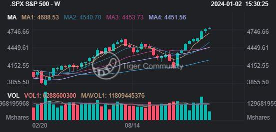 In 2023, the US stock market showed strong performance and repeatedly hit new highs, especially with the $NASDAQ(.IXIC)$ rising 43% for the year. $S&P 500(.SPX)$ and $DJIA(.DJI)$ also rose by 24% and 14% respectively, approaching and setting new historical highs.