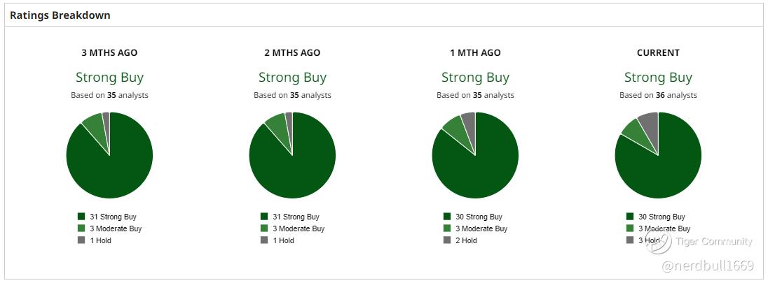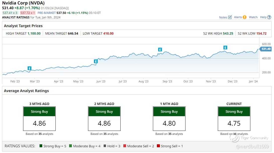 Out of the 35 analysts covering NVDA stock, 30 recommend “strong buy,” three recommend “moderate buy,” and two recommend “hold.” The average target price for NVDA is $653, indicating an upside potential of 37% from current levels.