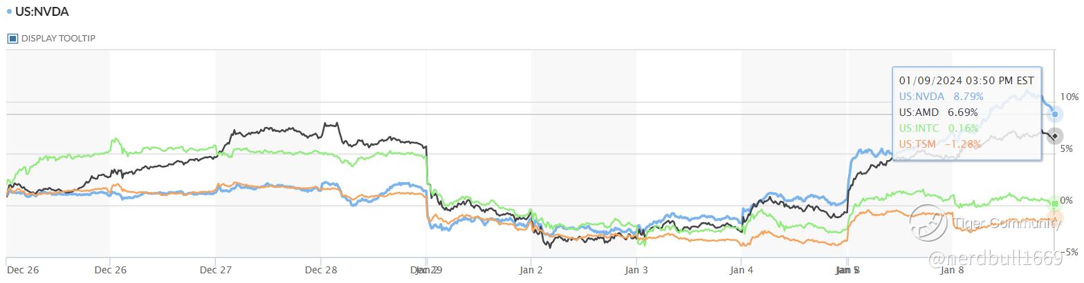 As we have seen how chip stocks announcement played out at the CES 2024, we can see $NVIDIA Corp(NVDA)$ and $Advanced Micro Devices(AMD)$ have been on an absolute tear over the last few days.