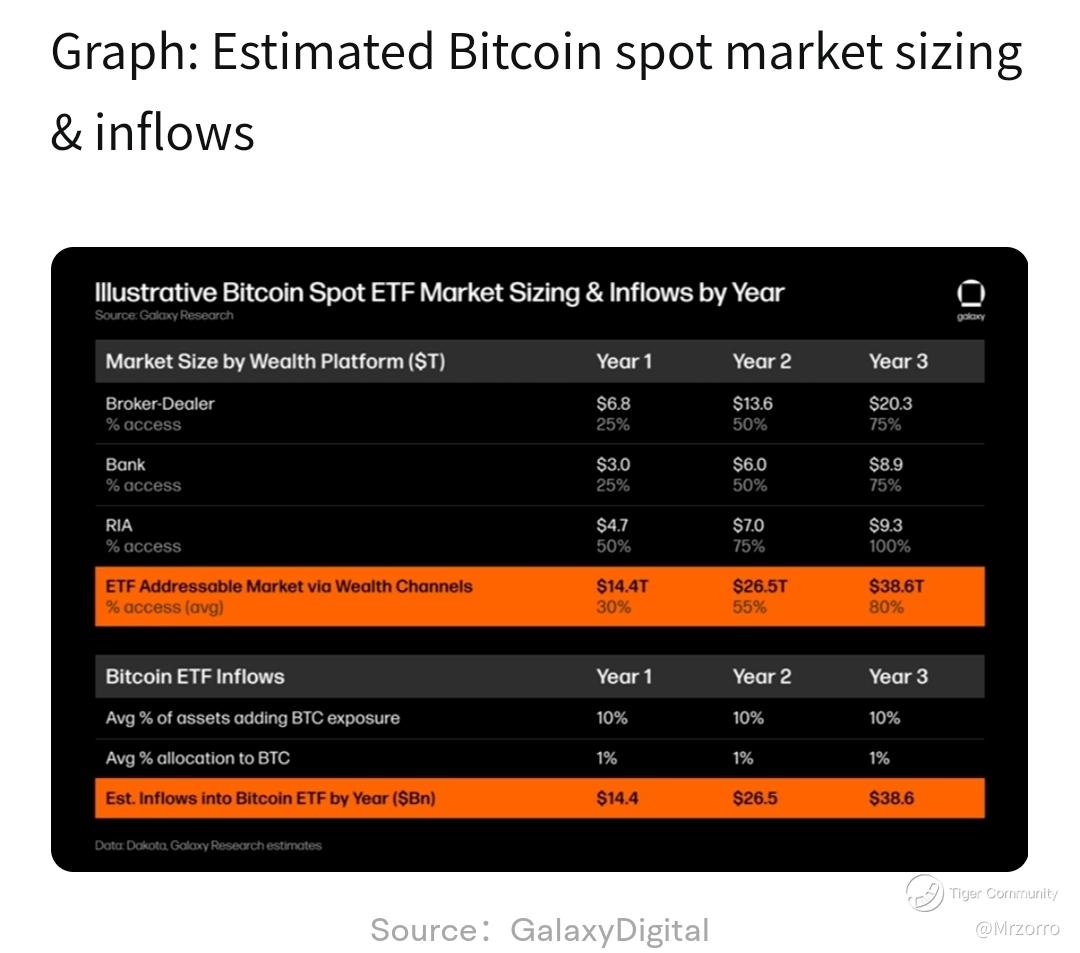 According to GalaxyDigital's calculations, based on the overall size of the US wealth management market, if it is assumed that Bitcoin accounts for 10% of the total available assets in each wealth channel (brokerage, bank, investment advisor), and the average allocation ratio is 1%, then in the first year after Bitcoin ETF is released, an estimated $14 billion will flow into it.